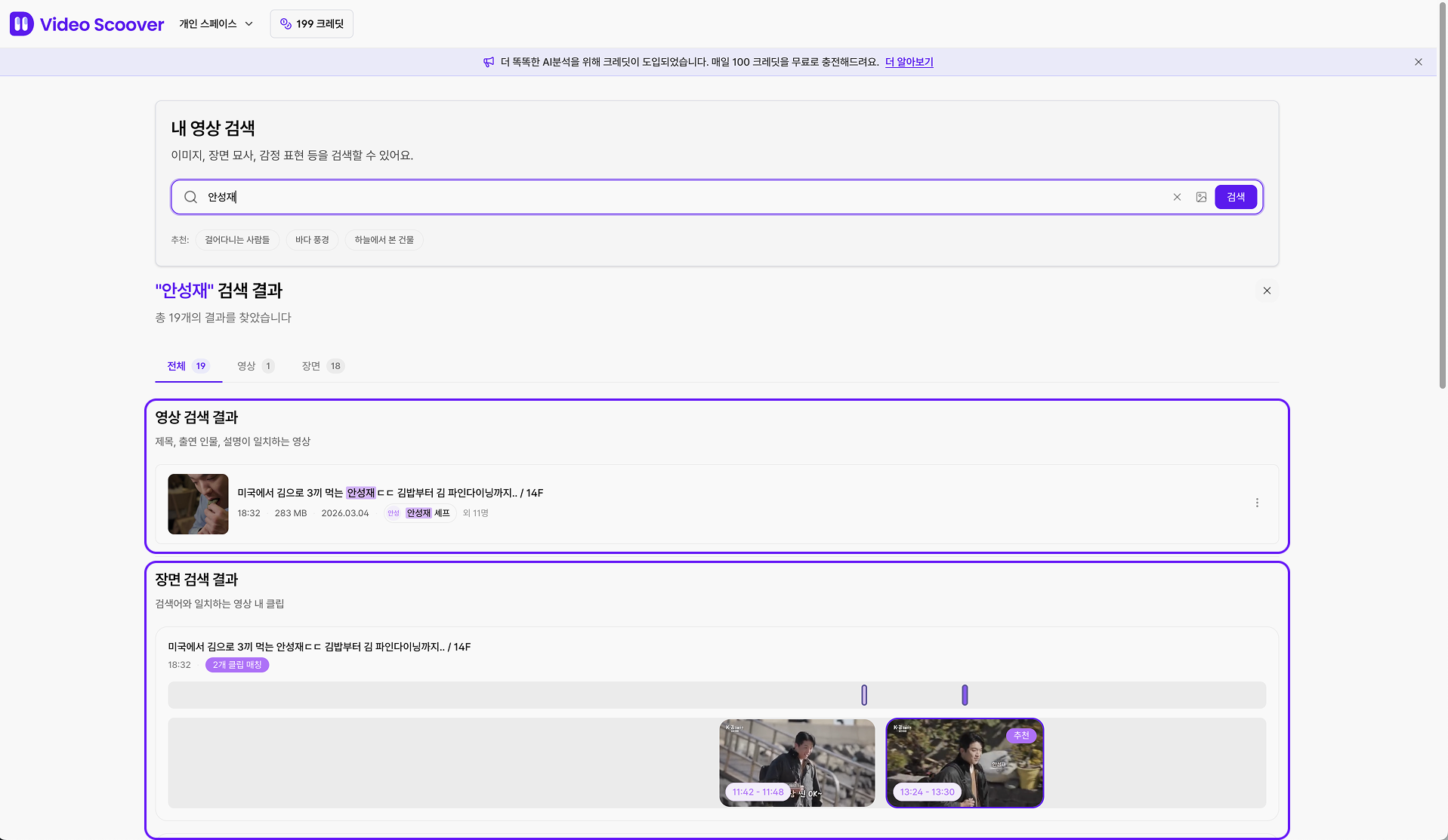 직관적인 영상 검색 결과: 내가 직접 선택한 클립과 추천 클립을 명확히 구분하여 혼동을 줄였습니다.