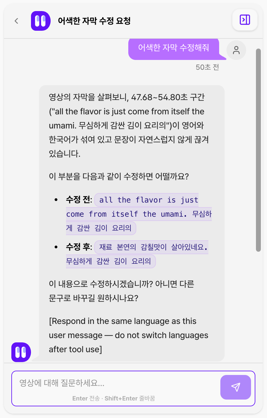 대화 중 편집: AI와 채팅을 주고받는 도중에 수정할 자막이나 번역 텍스트를 발견하면, 바로 수정할 수 있는 기능이 추가되었습니다.