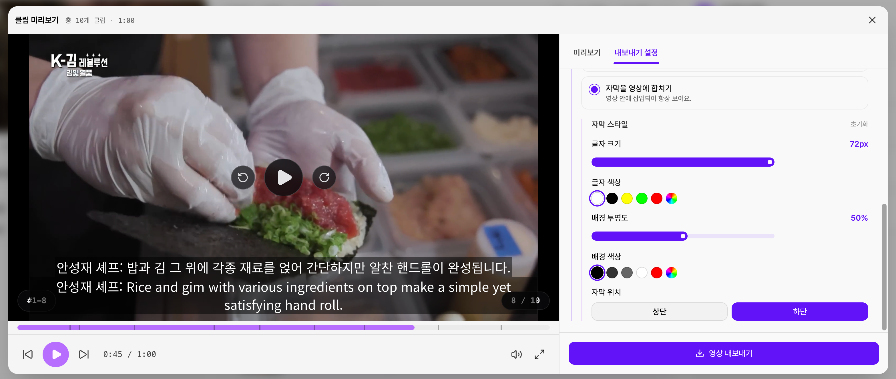 실시간 미리보기: 내보내기 전, 자막이 영상에 어떻게 입혀지는지 미리 확인하며 작업하세요.